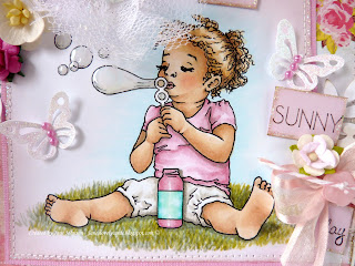 I have used the gorgeous Maya Blowing Bubbles by Crissy from Whimsy Stamps. Isn't she gorgeous!? I've coloured her with copics and added glossy accents to the bubbles. I've created the grass around her with copics too.