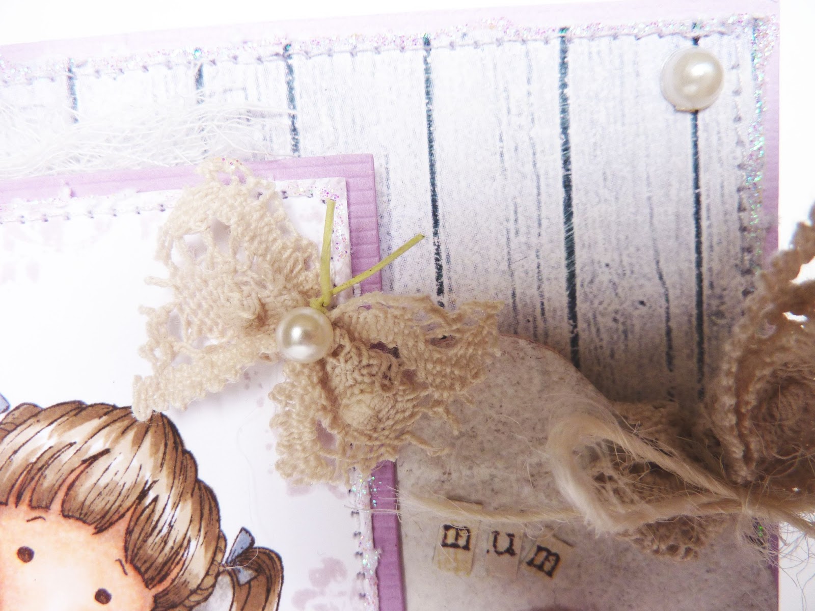 I have coloured Tilda with copics and used a white gel pen for the dots on her cheeks. I've stamped around the image mat with a Stempelglede stamp using Milled Lavender Distress Ink.The gorgeous flowers are all from The Ribbon Girl. I've used the Martha Stewart heart lace punch along the bottom edge of the image mat.