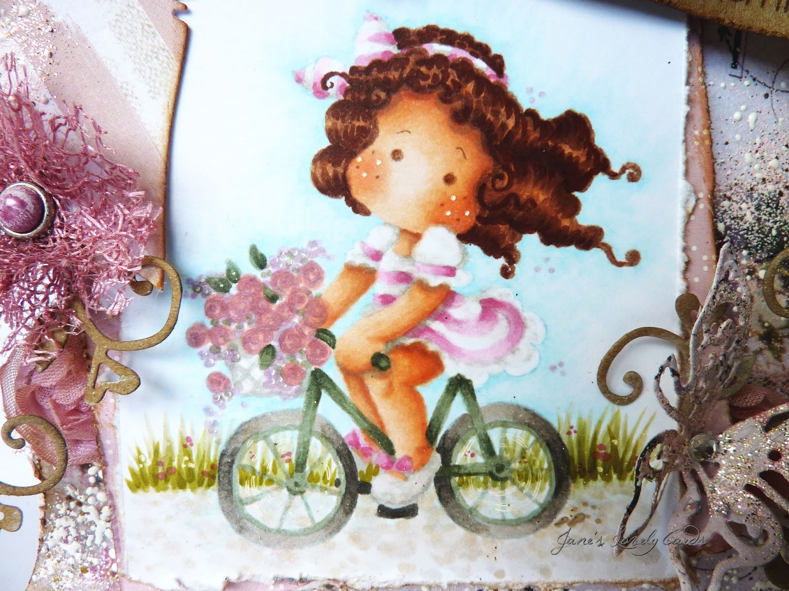 The gorgeous On the Road Tilda #268 and coloured her with copics using the no lines technique. I also created a little path and grass in the background with copics.The butterfly is a spellbinder die and the rose trim is from The Ribbon Girl. It is actually white but I have coloured it with some Glimmer Mist.