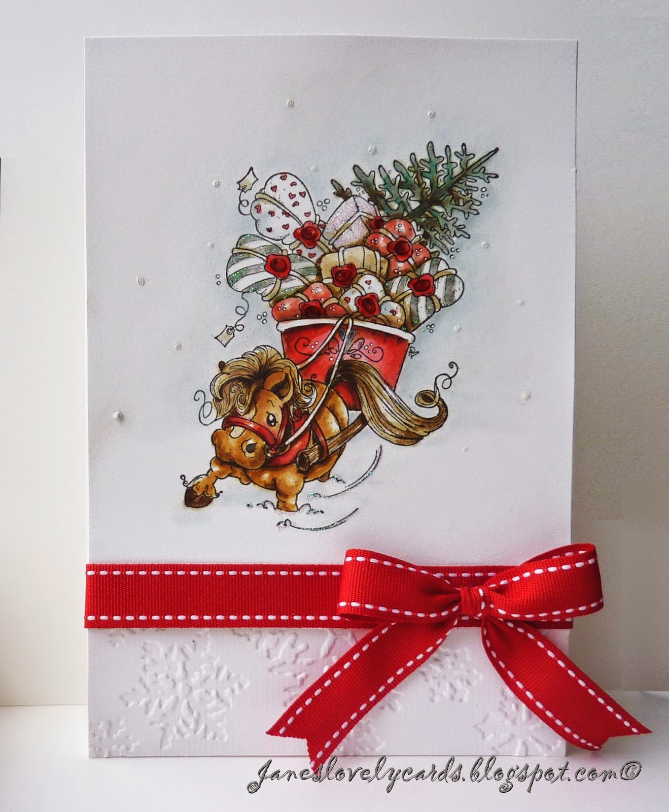 Good morning! It is time for our November card challenge over at The Ribbon Girl and our theme is 'Christmas'. Perfect for me as I still have lots more to make! On Friday some of the new Magnolia collection dropped into my letterbox and I couldn't wait to ink up this one, Christmas Delivery - it's such a fun image. Once I'd painted it my original idea for the card went out of the window as it just seemed so beautiful it cried out for clean and simple - not like me at all!